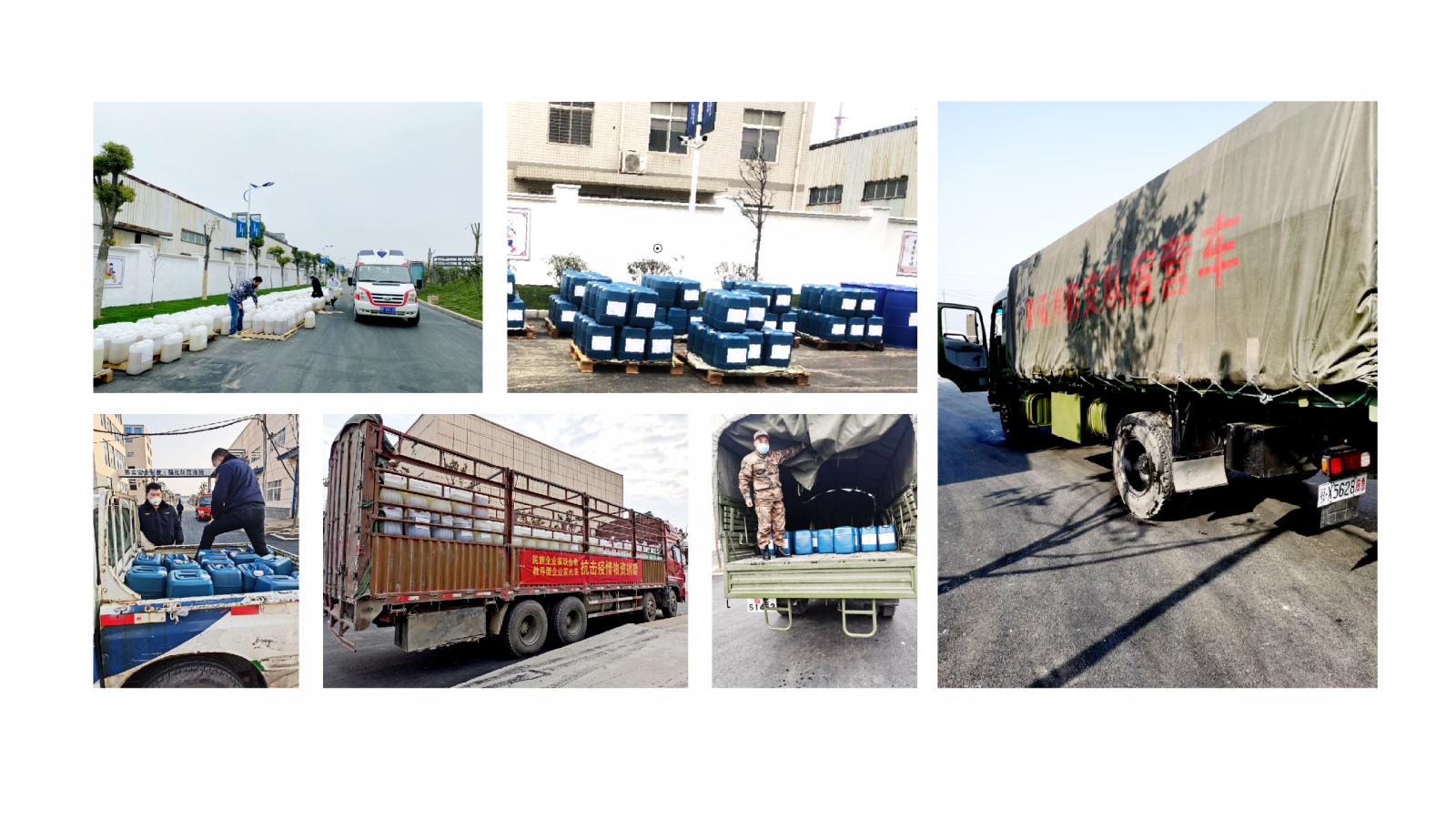 2020年年初新冠疫情全面爆發(fā),湖北又是全國的疫情中心。國難當頭,董事長帶領(lǐng)金達成部分領(lǐng)導(dǎo)主動請纓,勇?lián)厝?,面臨種種困難,發(fā)揮黨員沖鋒在前、迎難而上的作風,生產(chǎn)84消毒液原液三百余噸,市值達四百萬,全部無償捐贈給疫情最需要的地方。